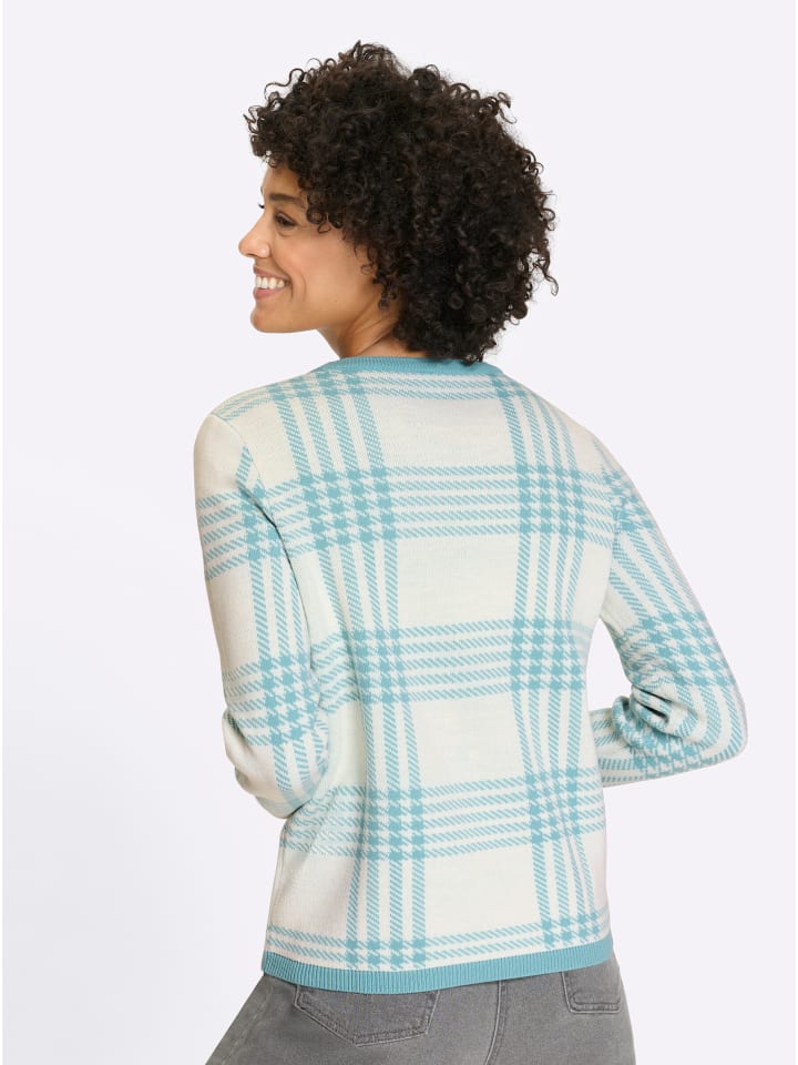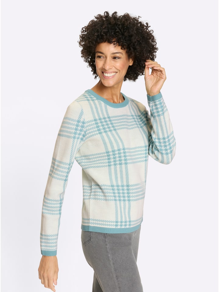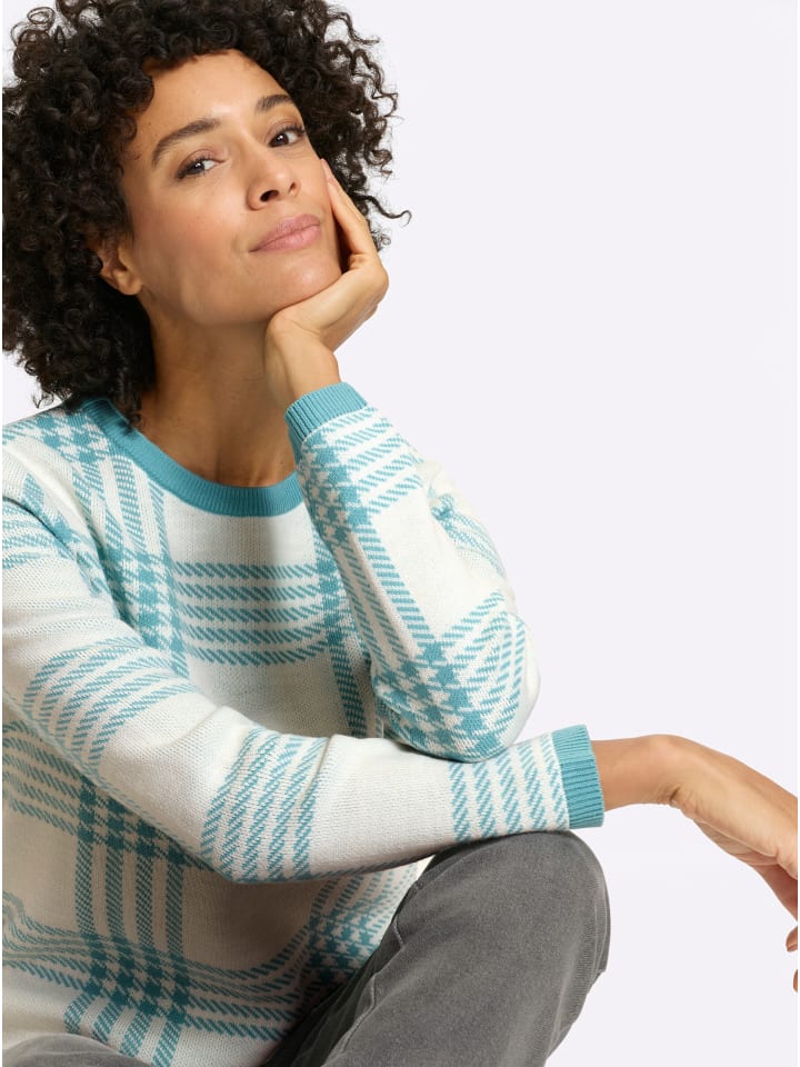 Свитер с круглым вырезом, выполненный в изысканном жаккардовом узоре в спортивную клетку. Ребристая отделка по вырезу горловины, длинным рукавам и низу выполнена в контрастном цвете. Ткань, не требующая особого ухода.