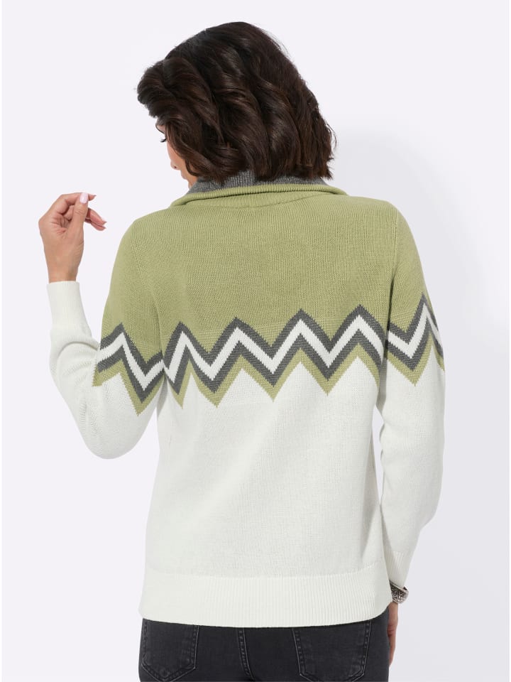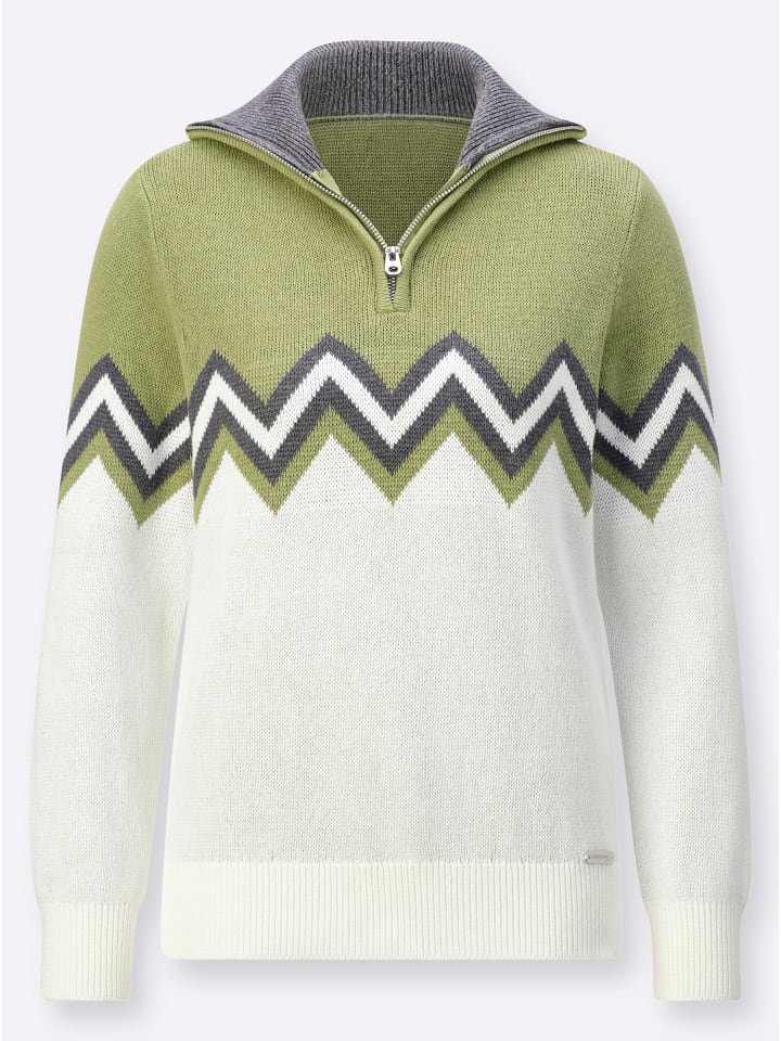 Зигзагообразный узор делает этот свитер одним из самых популярных. Он дополнен контрастной внутренней водолазкой на молнии и ребристыми манжетами на длинных рукавах и подоле. Поддерживает инициативу «Хлопок, сделанный в Африке».