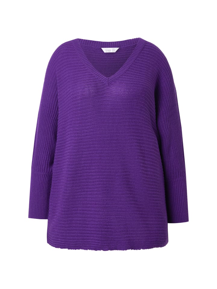 Очень широкий свитер-пончо из мягкой горизонтальной пряжи с V-образным вырезом, спущенными плечами и длинными манжетами.