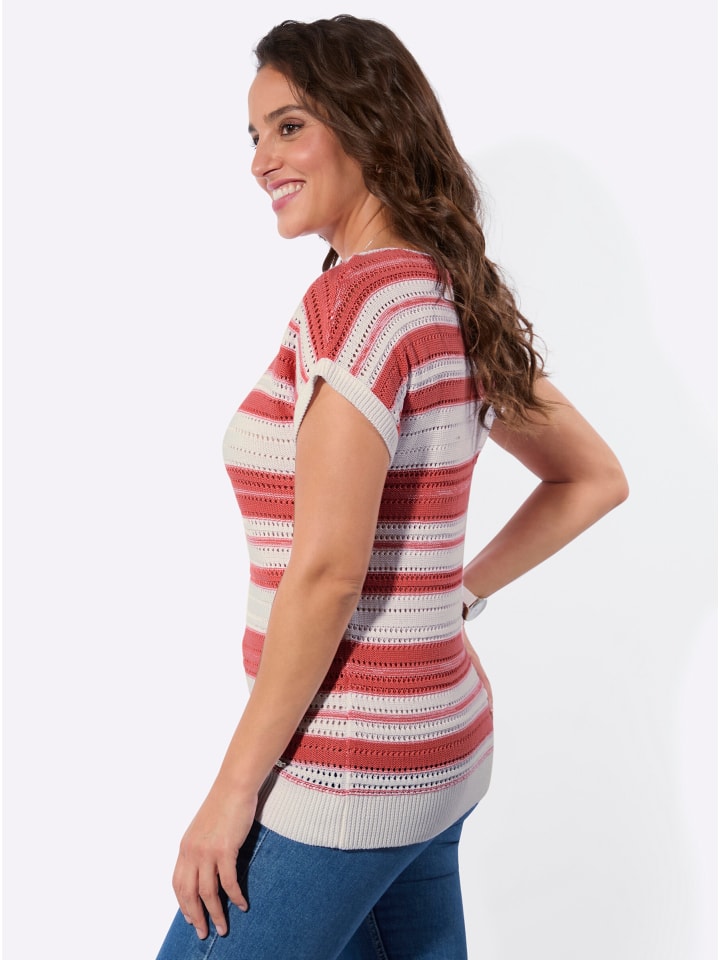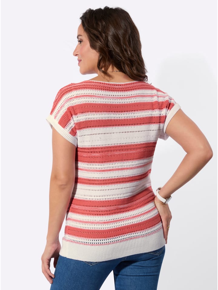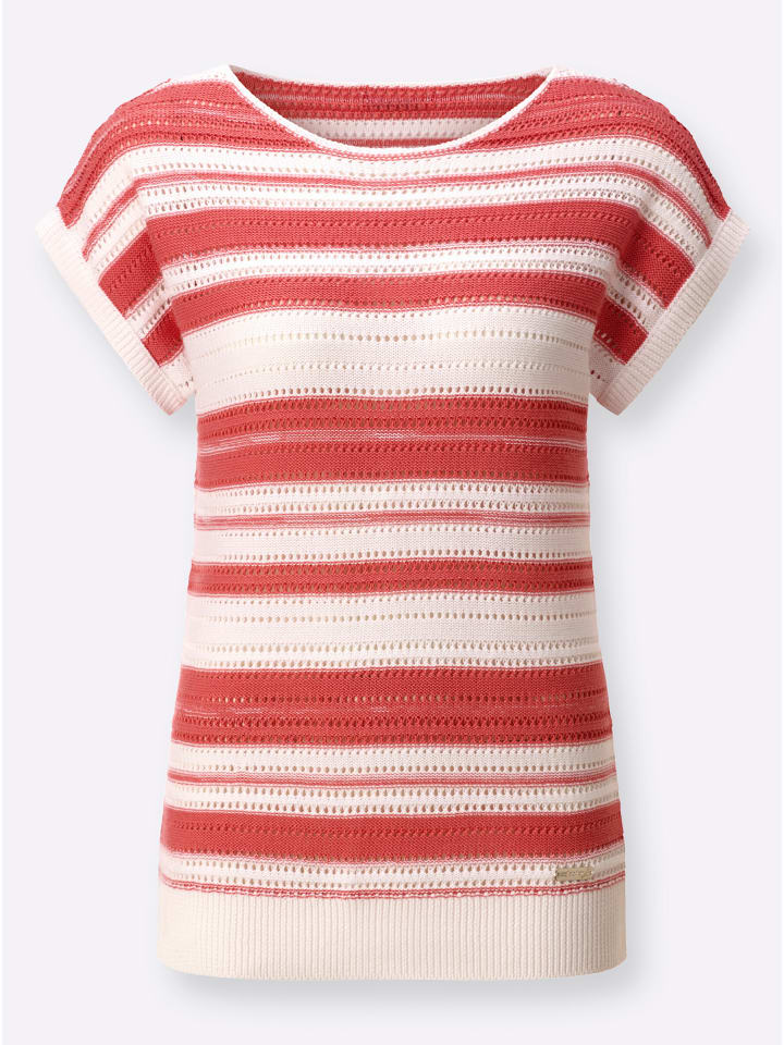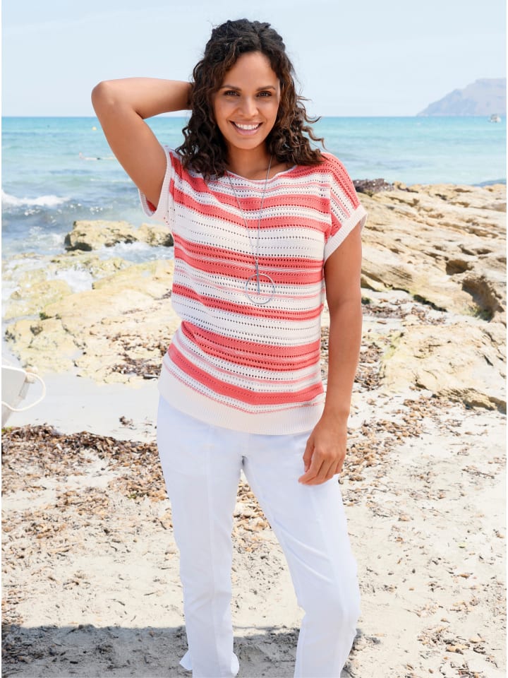 Этот воздушный ажурный трикотажный жилет в полоску выполнен из мягкой меланжевой пряжи. Он имеет вырез горловины «лодочка», свободно спущенные плечи и контрастные резинки на манжетах и подоле. Сертифицировано OCS.