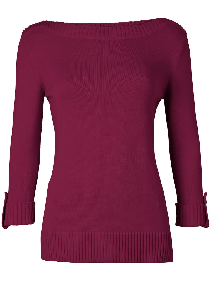 Удивительно удобный свитер с вырезом лодочкой и рукавами 3/4, с модным отворотом, декоративной хлястиком и пуговицей. Манжеты и низ - резинка.