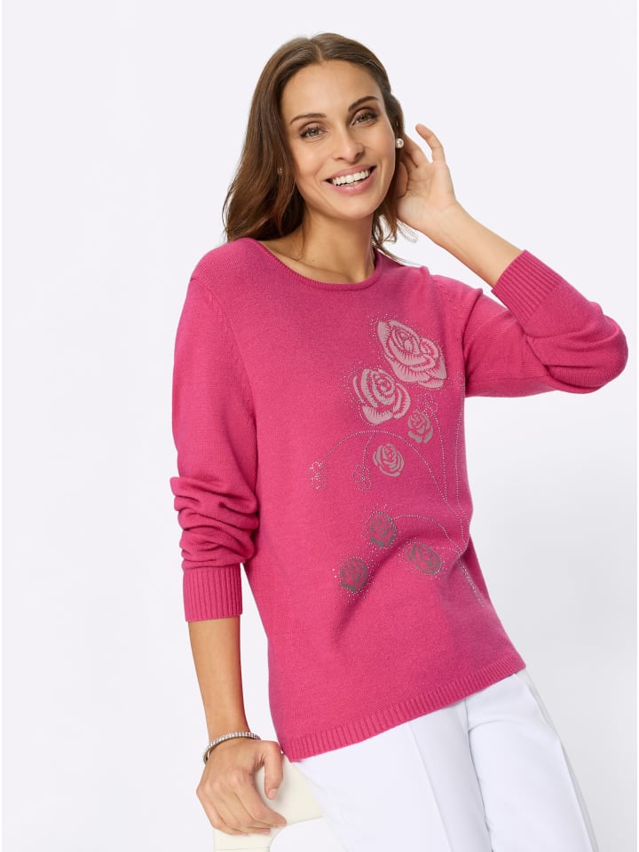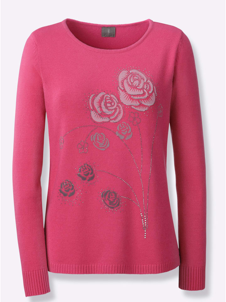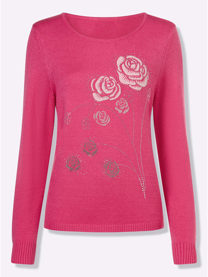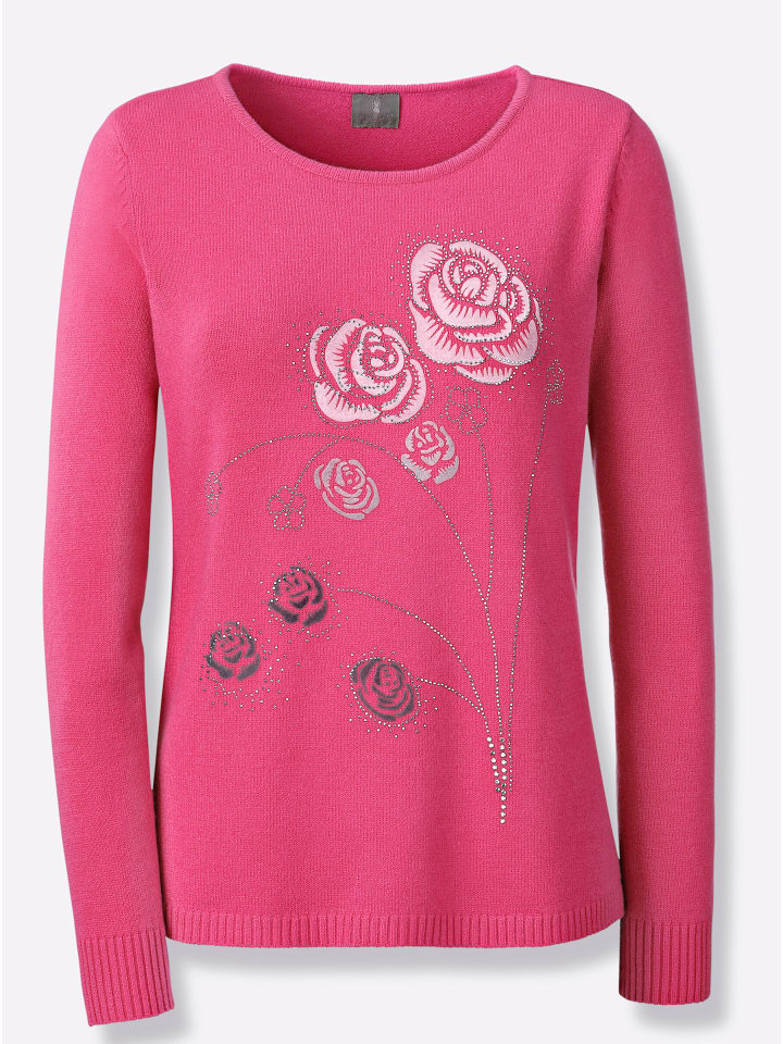 Элегантный свитер привлекает внимание цветочным узором и отделкой стразами спереди. Манжеты и подол - резинкой.