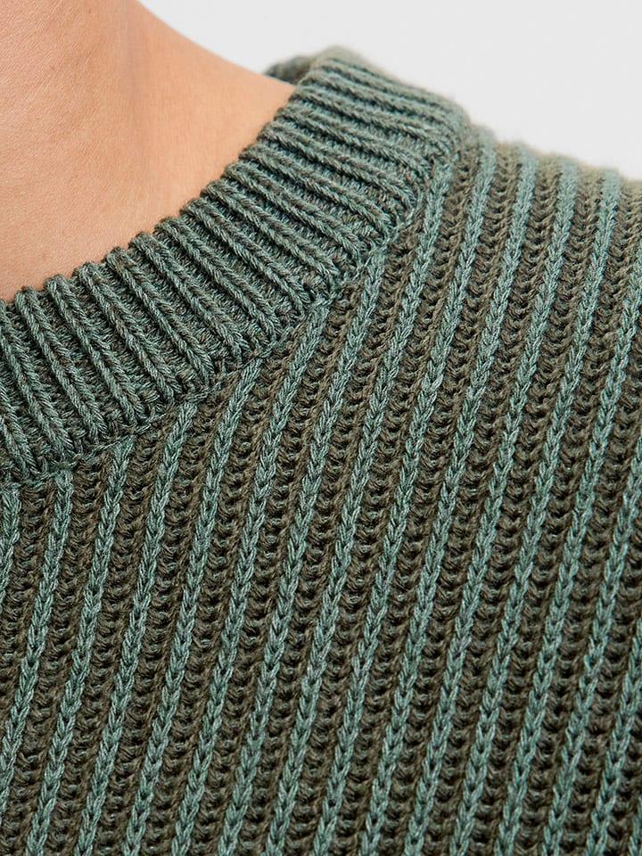 - Ребристая вязка: Вырез горловины, манжеты, подол