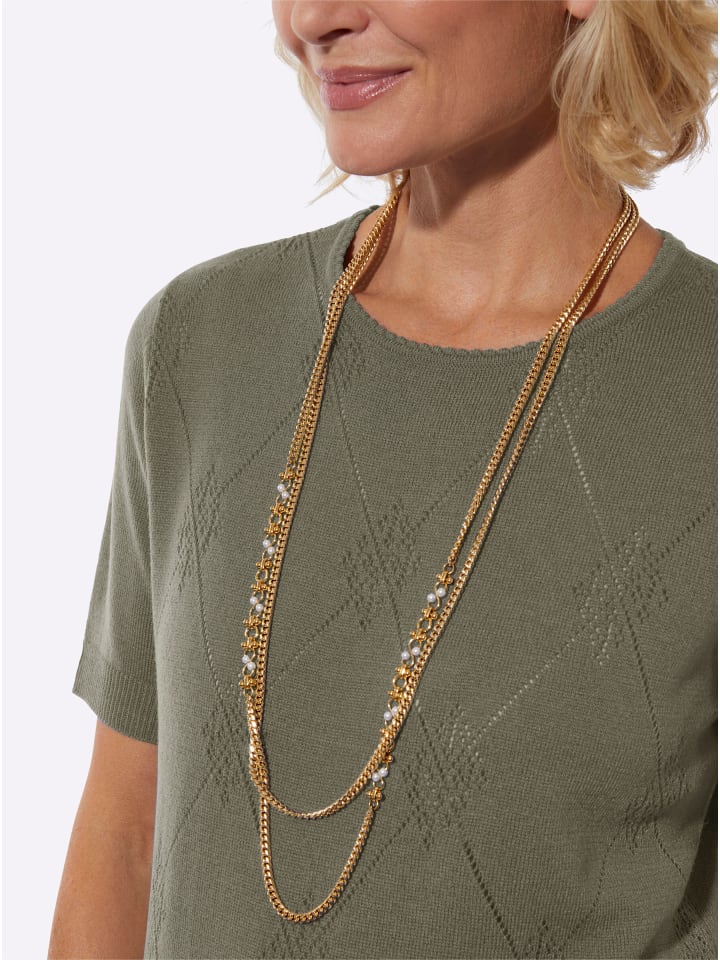 Универсальный многослойный предмет одежды: свитер с изящным ажурным узором. Короткие рукава и гладкая трикотажная спинка. Тщательно продуманный крой для идеальной посадки. Ребристые манжеты и низ.