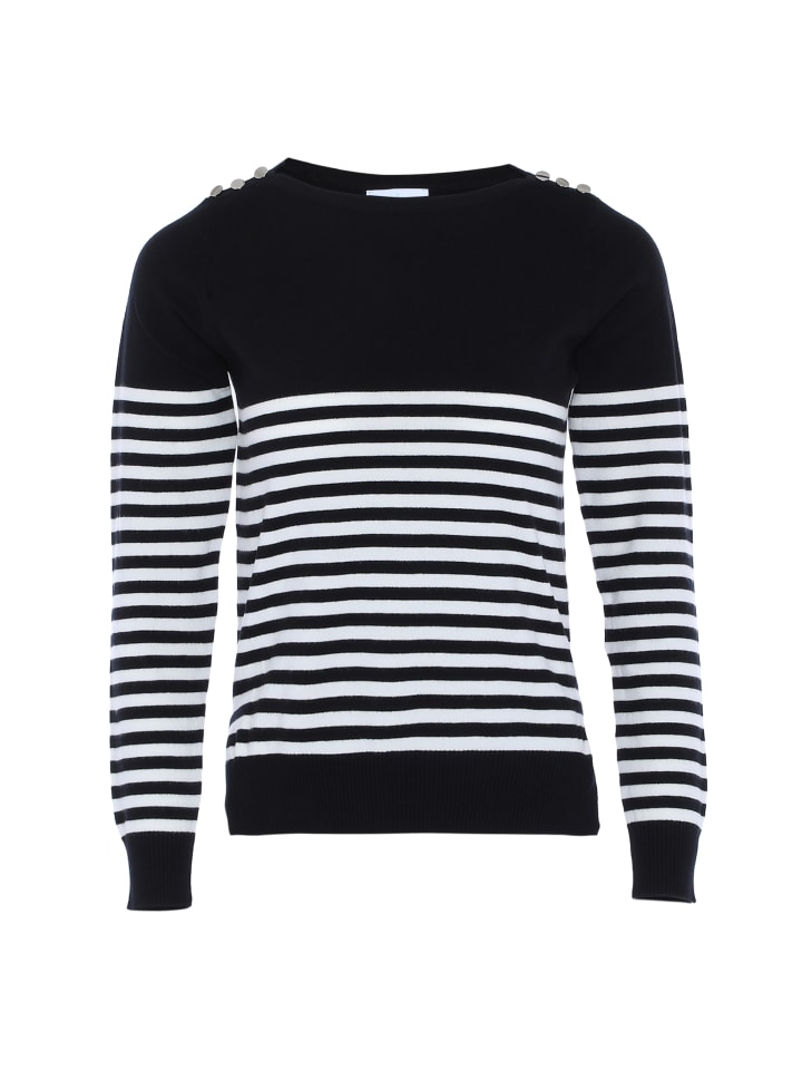 Стильное дополнение к вашему гардеробу - свитер с длинными рукавами и горизонтальными полосками на корпусе и рукавах. Круглый вырез горловины, ребристые манжеты и подол обеспечивают комфортную и уютную посадку. Украшен декоративными элементами, напоминающими пуговицы или заклепки, вдоль линии плеча для дополнительной элегантности. Идеально подходит для тепла и уюта, создавая непринужденный и элегантный образ.