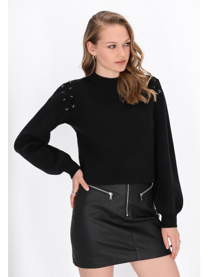 Откройте для себя свитер из коллекции Mymo Rock со стандартным кроем и стильным круглым вырезом. Длинные рукава-бишоп украшены металлическими люверсами и шнуровкой для создания привлекательного образа. Этот удобный вязаный свитер отличается гладким узором, сочетающим непринужденный стиль с современной молодежной модой.