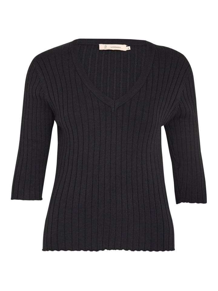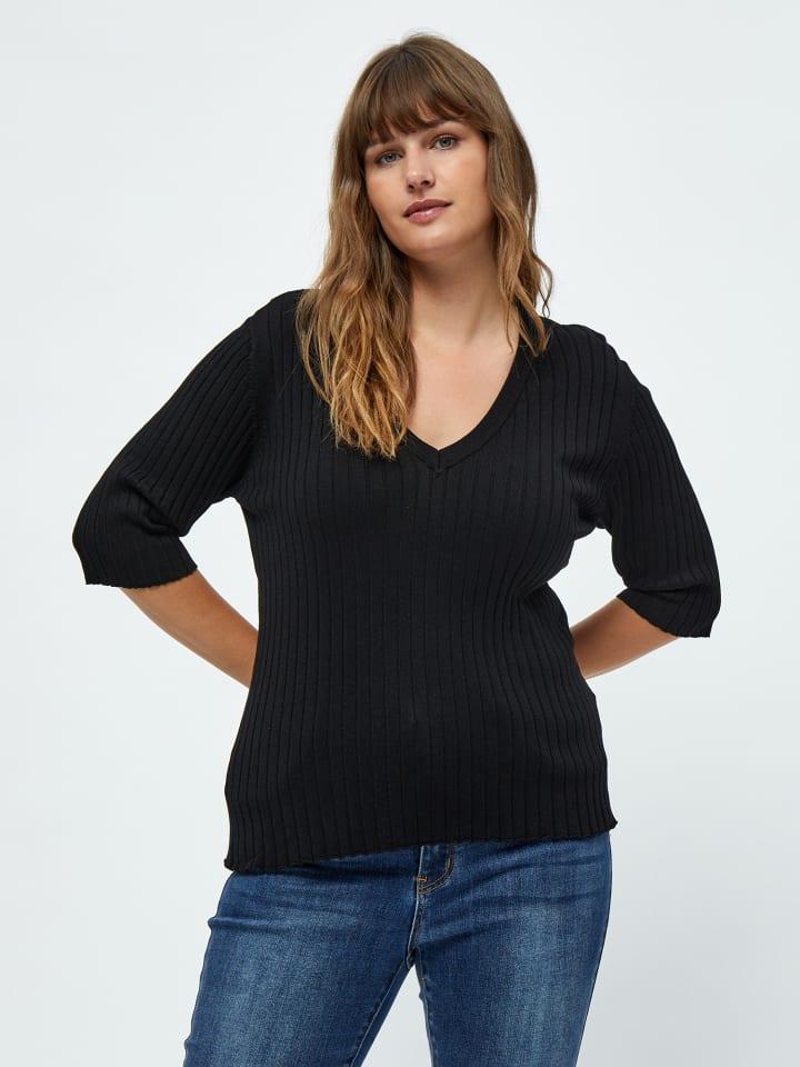 Красивый трикотажный топ с ребристой текстурой. Он имеет V-образный вырез, рукава три четверти и изготовлен на 75% из экологически чистых материалов. Цвет идеально подходит для весны.
