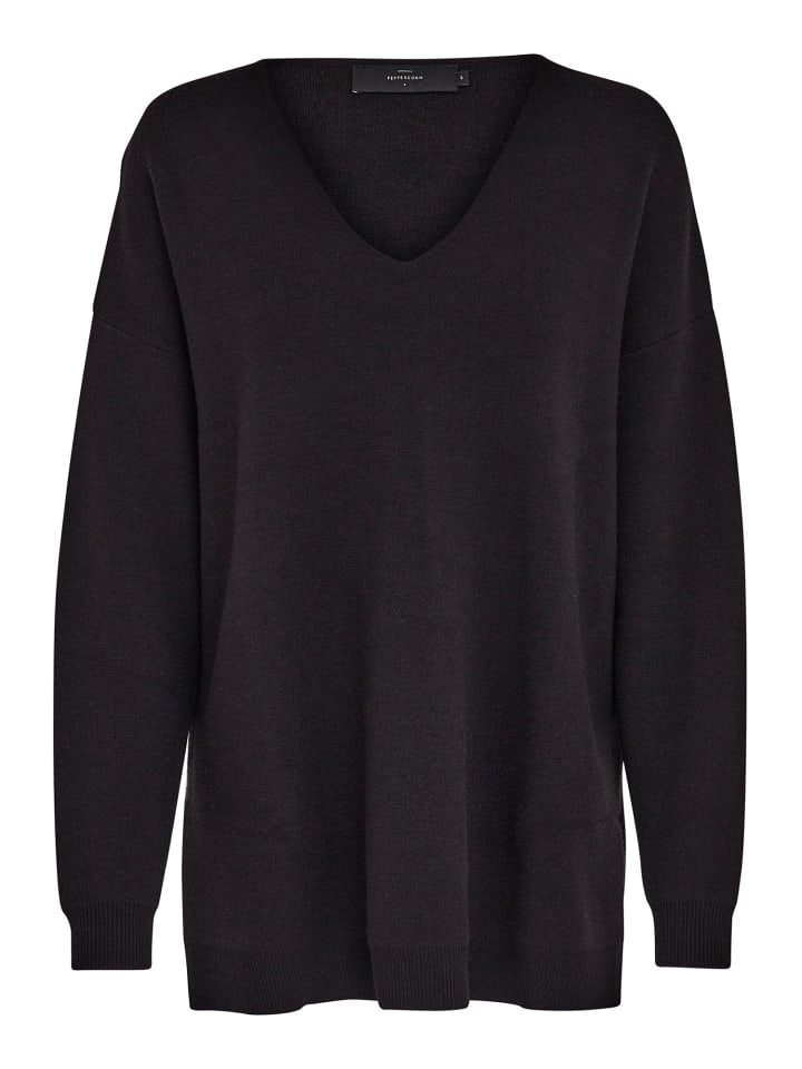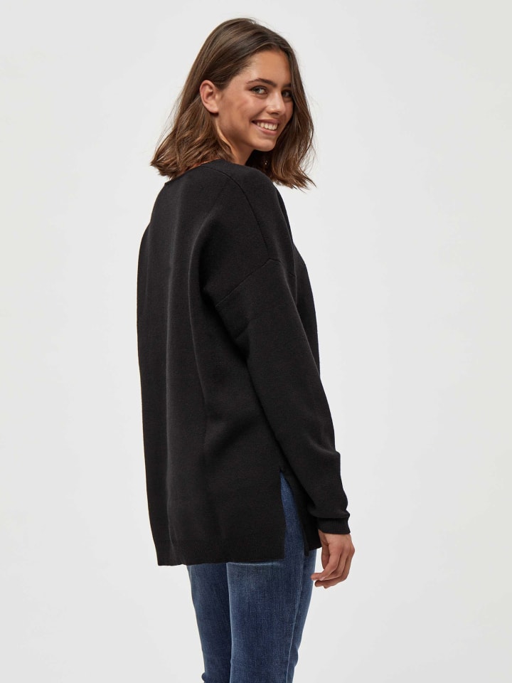 Свитер со спущенными плечами и V-образным вырезом, стандартными рукавами и разрезами по бокам. Свитер связан из мягкой пряжи с добавлением вискозы плотным переплетением «полная игла». Он плотный, но невероятно мягкий и удобный.