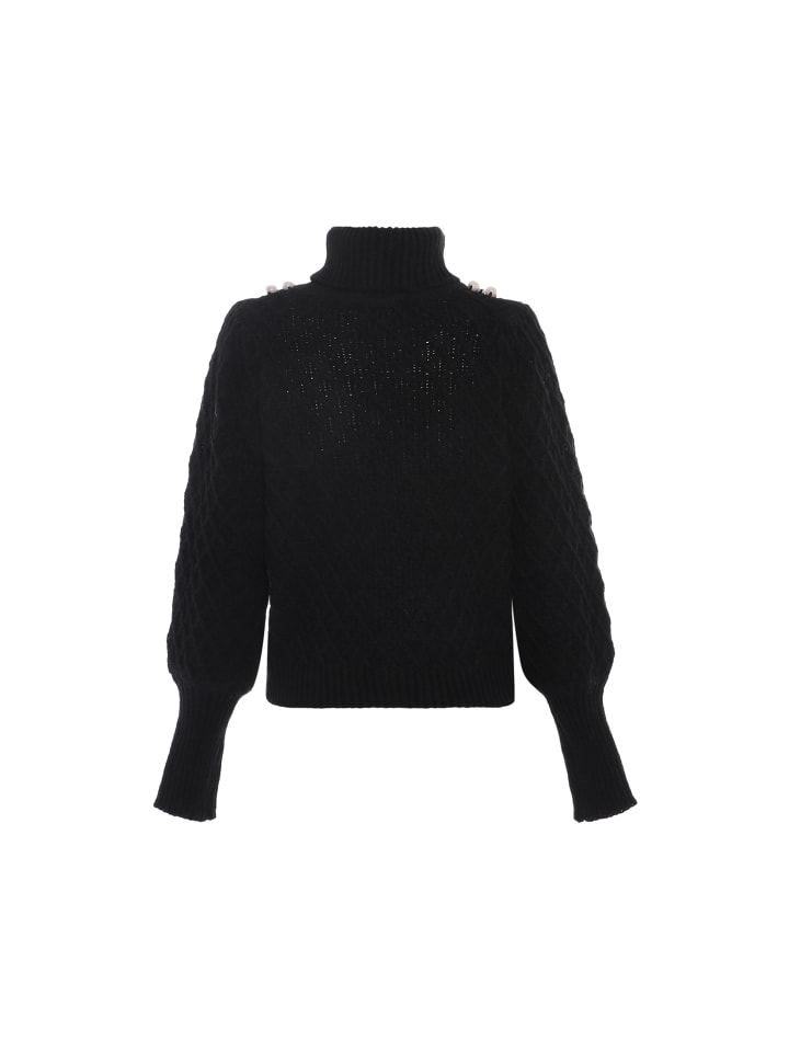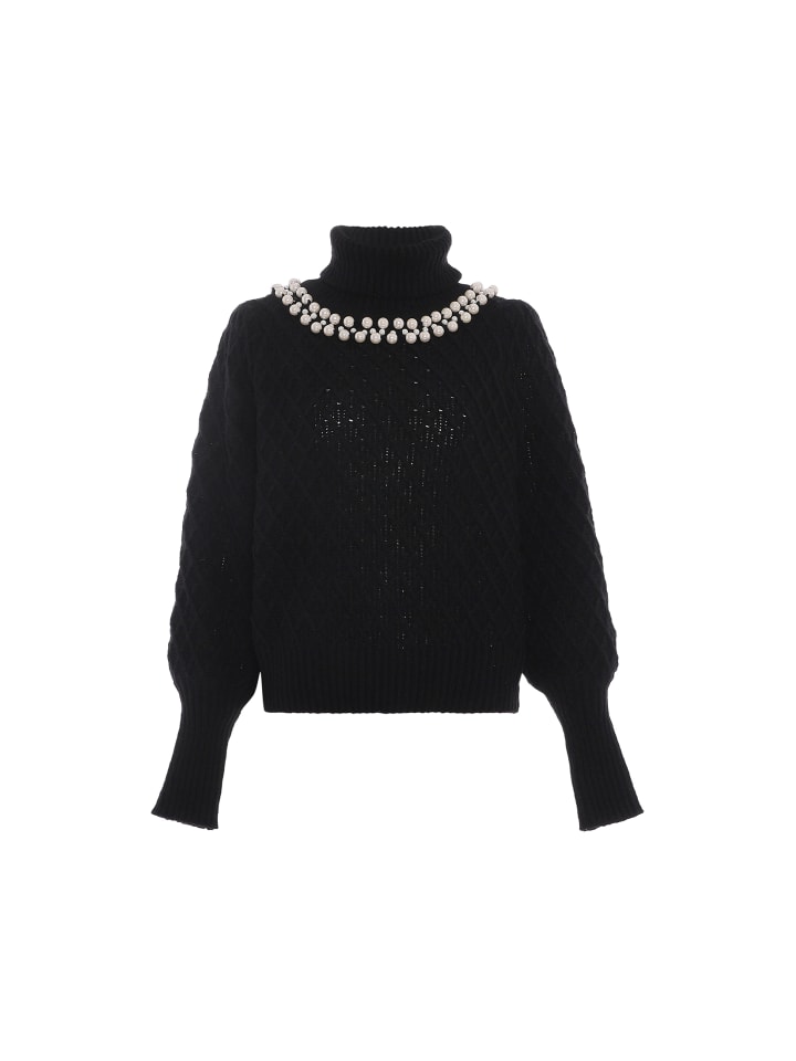 Представляем шикарный вязаный свитер с элегантным воротником-стойкой и уникальным ромбовидным узором. Изделие отличается длинными рукавами, приталенным подолом и изысканным декоративным элементом на вырезе, напоминающим нежное жемчужное или бисерное ожерелье.