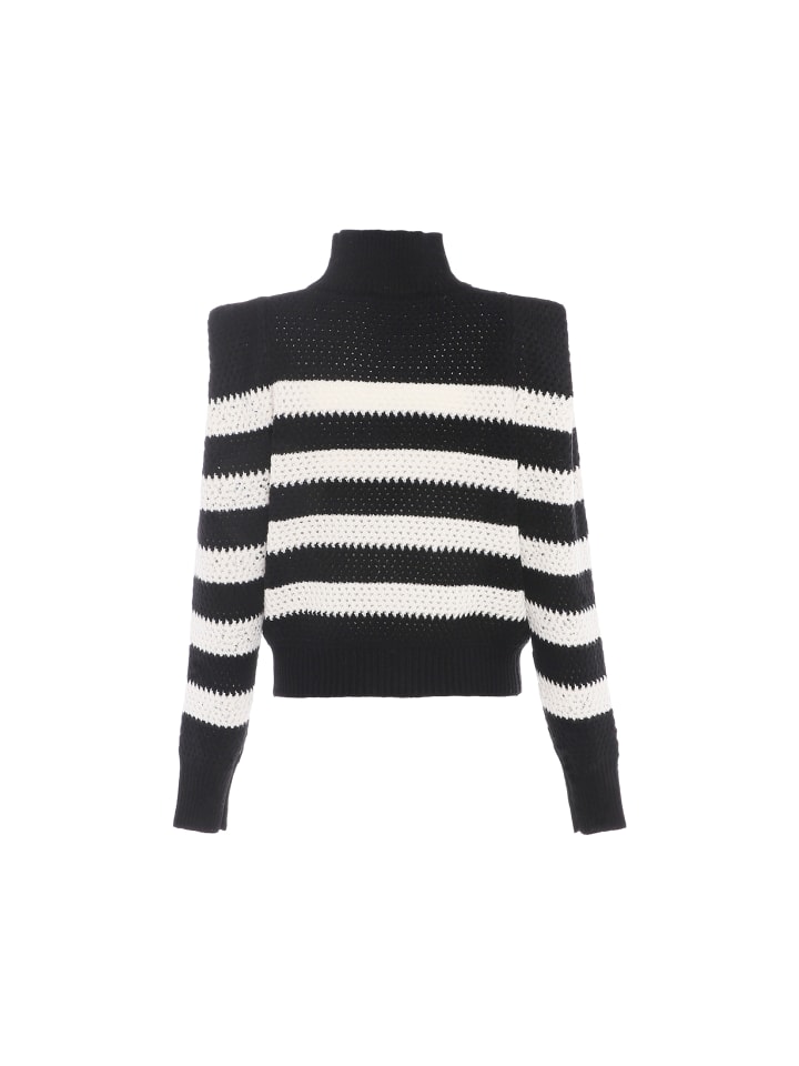 Откройте для себя этот шикарный свитер, сочетающий элегантность и комфорт. Он имеет классический крой и воротник-стойку. Длинные рукава украшены пуговицами на широких плечах. Ажурный вязаный узор и полосатый рисунок подчеркнут ваш стиль. Этот свитер универсален, идеально подходит для любого случая и обеспечивает комфорт. Он входит в коллекцию Fashion Look.