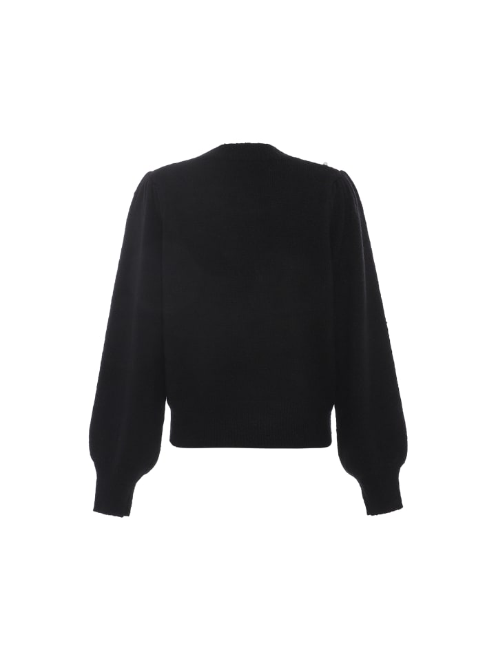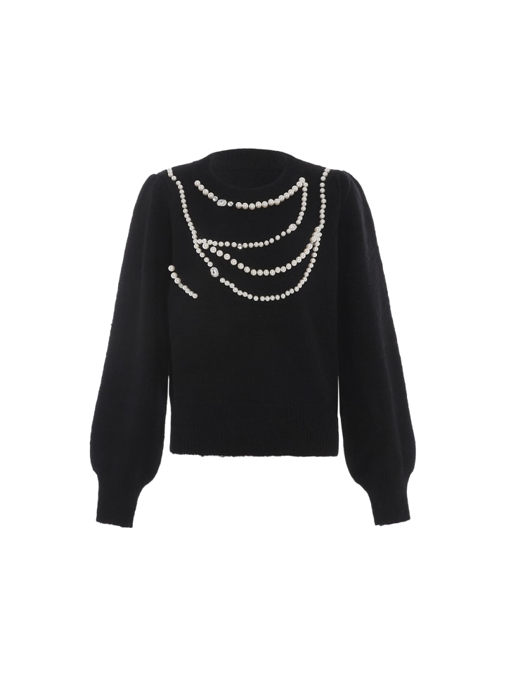 Окунитесь в очарование этого изысканного свитера с очаровательным декоративным элементом, напоминающим каскад жемчужных нитей, украшающих грудь. Ребристая текстура на манжетах и подоле обеспечивает удобную посадку, а круглый вырез горловины - комфорт и удобство.