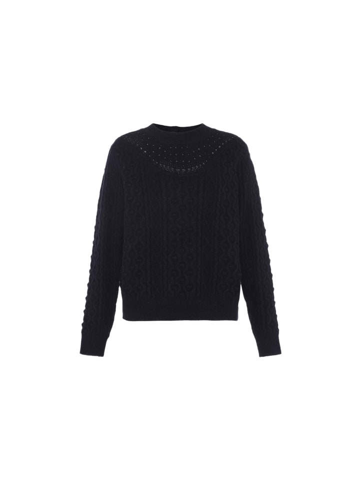 Представляем трикотажный свитер с длинными рукавами и круглым вырезом, украшенный фактурным узором из кос и различными узорами вязки для тактильных ощущений. Вязка выполнена равномерно по всему телу и рукавам, а также имеет открытую вставку на плечах и груди. Ребристая резинка по низу, манжетам и вырезу обеспечивает комфортную посадку. Традиционный крой обеспечивает свободную посадку по фигуре.