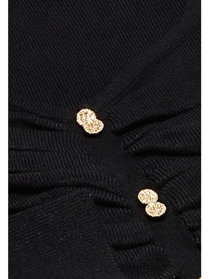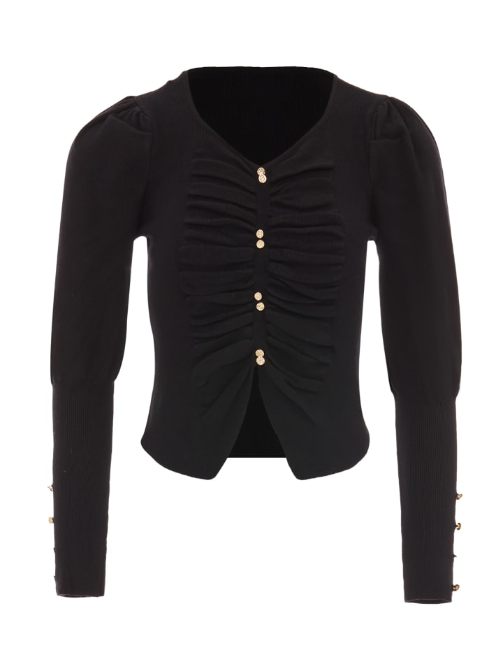 Этот приталенный кардиган, выполненный с особым вниманием к деталям, имеет ребристую фактуру и глубокий V-образный вырез. Передняя часть украшена замысловатым сборчатым узором, создающим дополнительную текстуру и визуально интересный вид. Украшенный декоративными пуговицами по центру переда и на манжетах рукавов, этот кардиган излучает изысканность. Разработанный совместно с CARNEA, этот кардиган сочетает в себе вневременной стиль и современный дизайн.