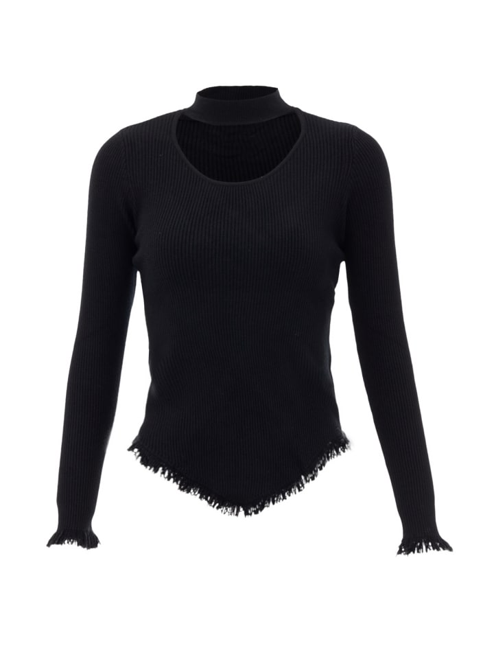 Украсьте свой гардероб этим свитером из ребристого трикотажа с имитацией водолазки и приталенным силуэтом. Уникальный фактурный рисунок обеспечивает эластичность и облегание, а намеренно бахромчатый край создает ощущение непринужденности и поношенности. Отделанные манжеты завершают образ и подчеркивают форму и контуры вашего тела, создавая стильный и выразительный образ. Этот свитер, разработанный совместно с ebeeza, сочетает в себе классический стиль и современный дизайн.