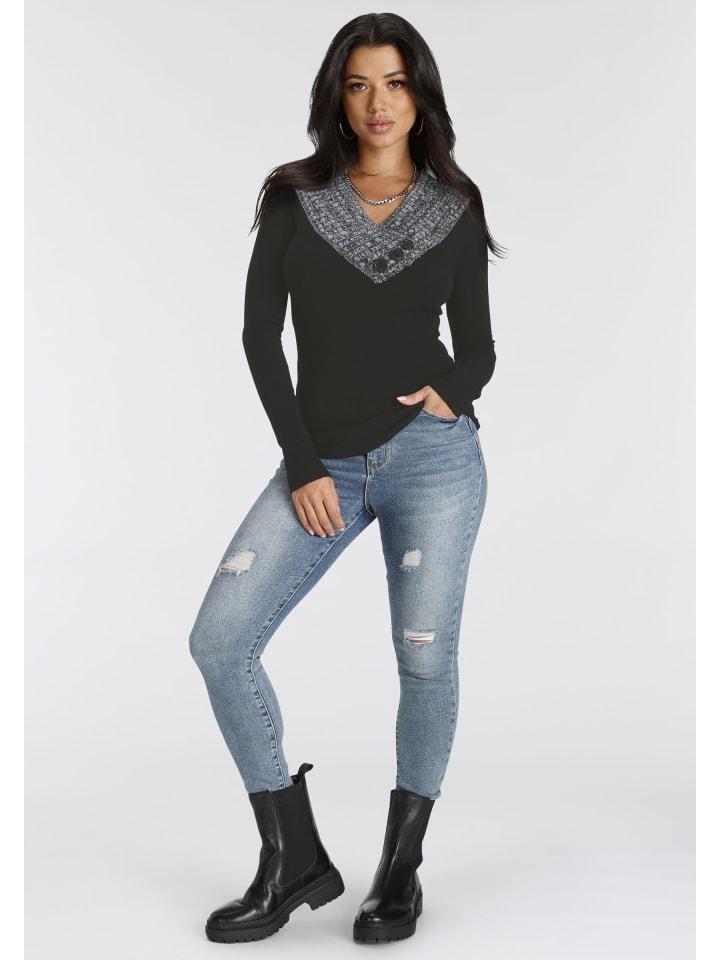 Универсальный женский трикотажный свитер от Melrose с контрастными деталями. Он имеет облегающий крой длиной до бедер и длинные рукава. Он украшен модными и стильными декоративными пуговицами. Благодаря эластичной тонкой вязке свитер обеспечивает свободу движений и сохраняет тепло.