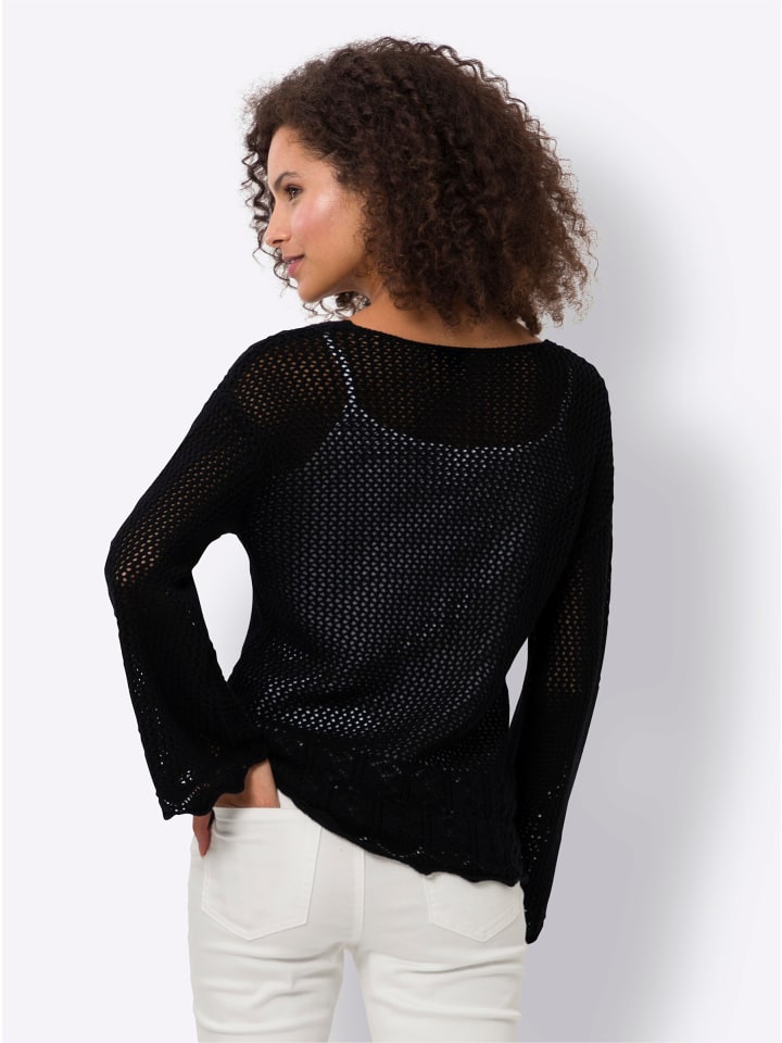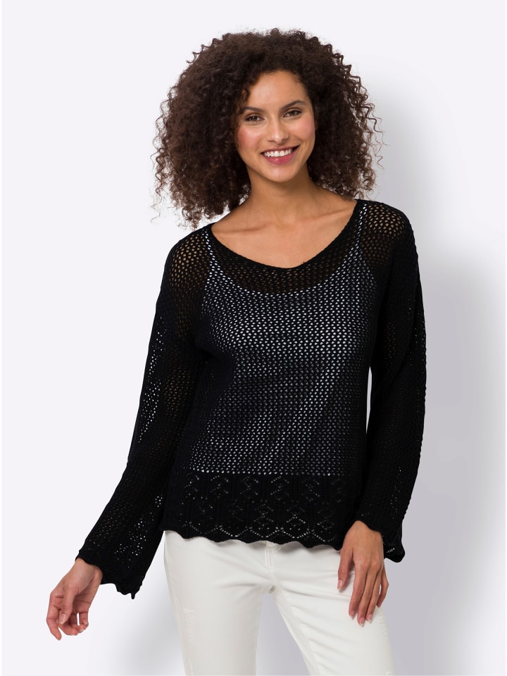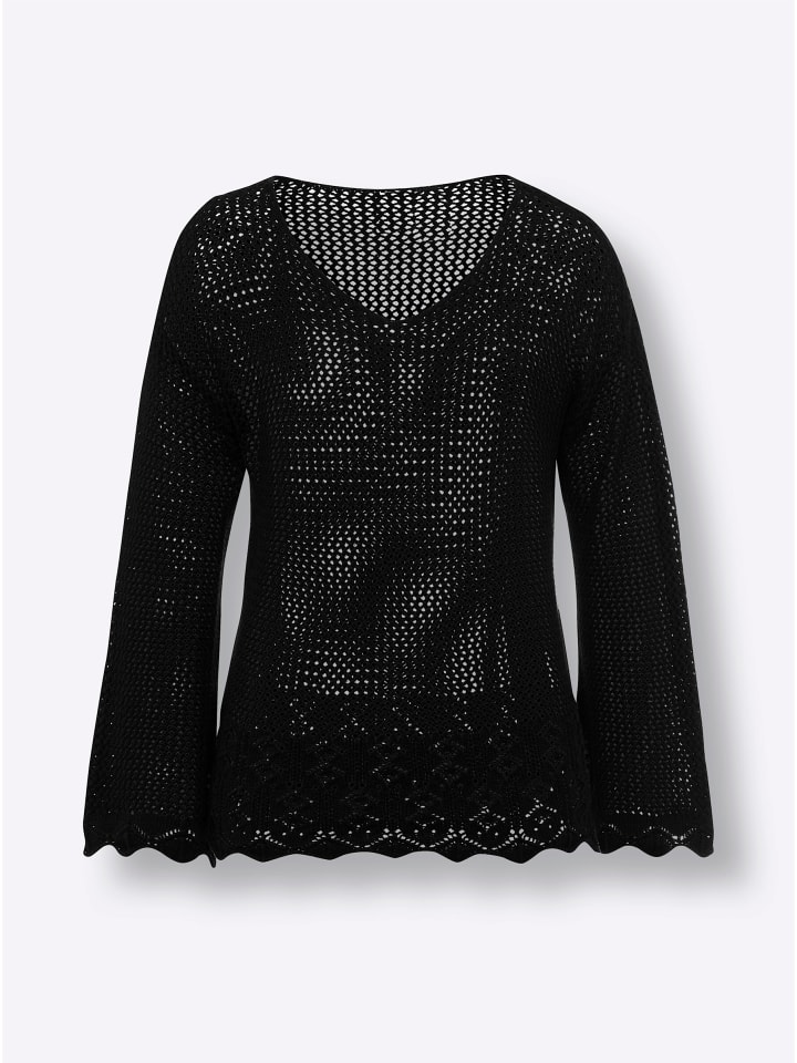 Прекрасный воздушный свитер из комфортной ажурной ткани из чистого хлопка. С женственным фестончатым подолом. V-образный вырез, слегка расклешенные длинные рукава и спущенная линия плеча. Сертифицировано GOTS.