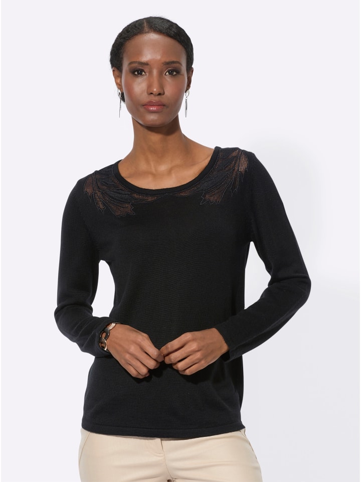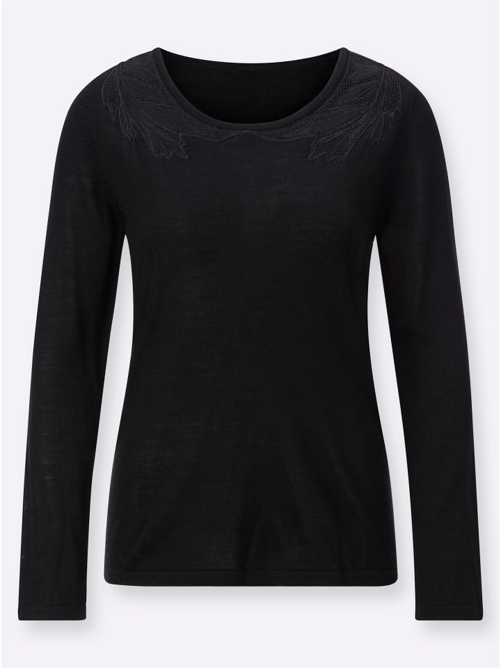 Изысканность и очарование: высококачественный приталенный свитер из шерстяной смеси с длинными рукавами. Под круглым вырезом слегка прозрачные сетчатые вставки с изящной вышивкой в виде листьев создают женственный и модный образ.