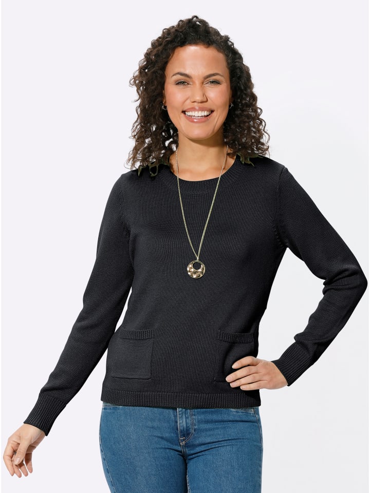 Свитер с круглым вырезом, накладными карманами и ребристыми манжетами и подолом. Тщательно связан для идеальной посадки.