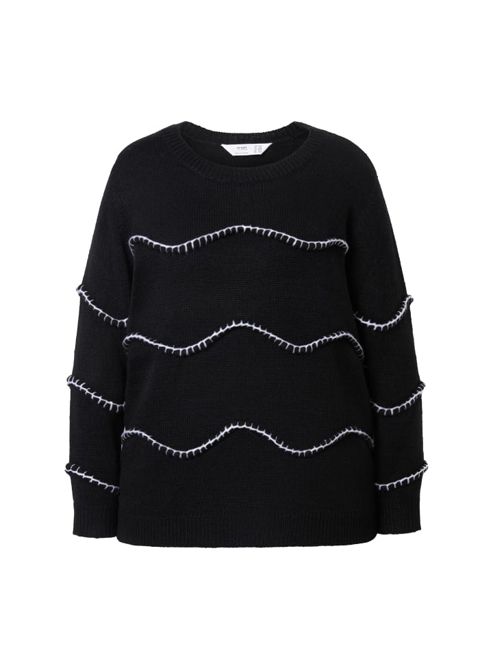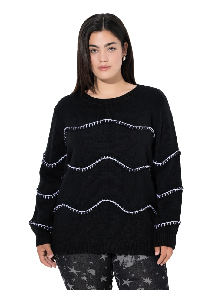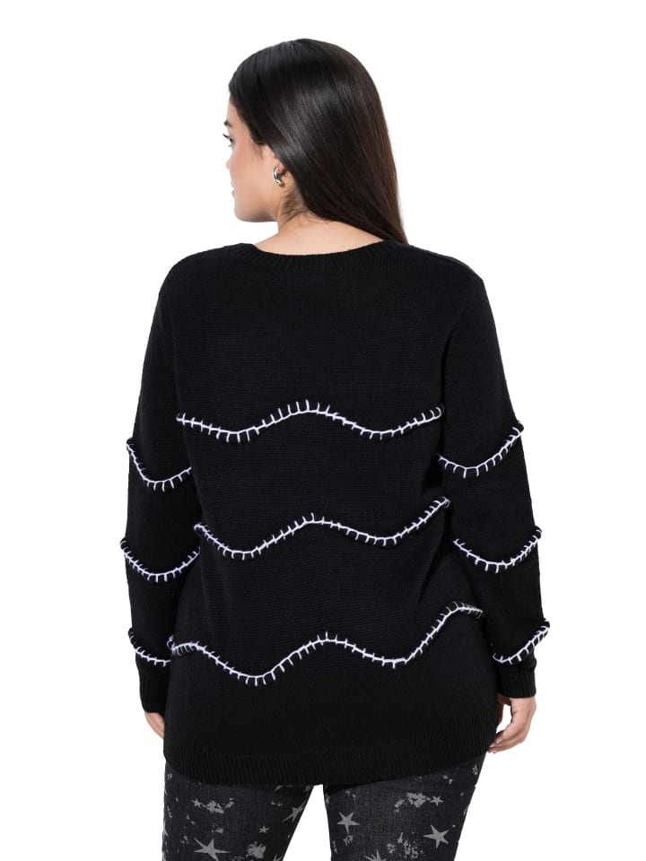 Свитер прямого кроя из мягкой тонкой пряжи с волнистым узором. Круглый вырез, длинные рукава, манжеты на резинке.