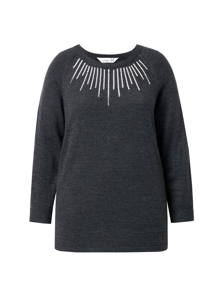 Свитер удобного кроя с пайетками на круглом вырезе. Длинные рукава реглан с манжетами в рубчик.