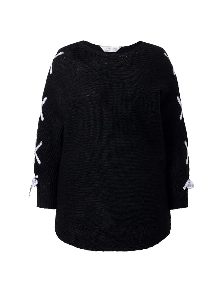 Свитер свободного кроя из мягкой резинки. Широкие рукава «летучая мышь» с декоративной шнуровкой неонового цвета. Круглый вырез горловины, манжеты в рубчик, закругленный низ.