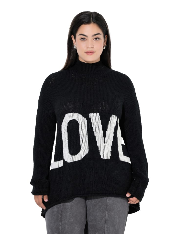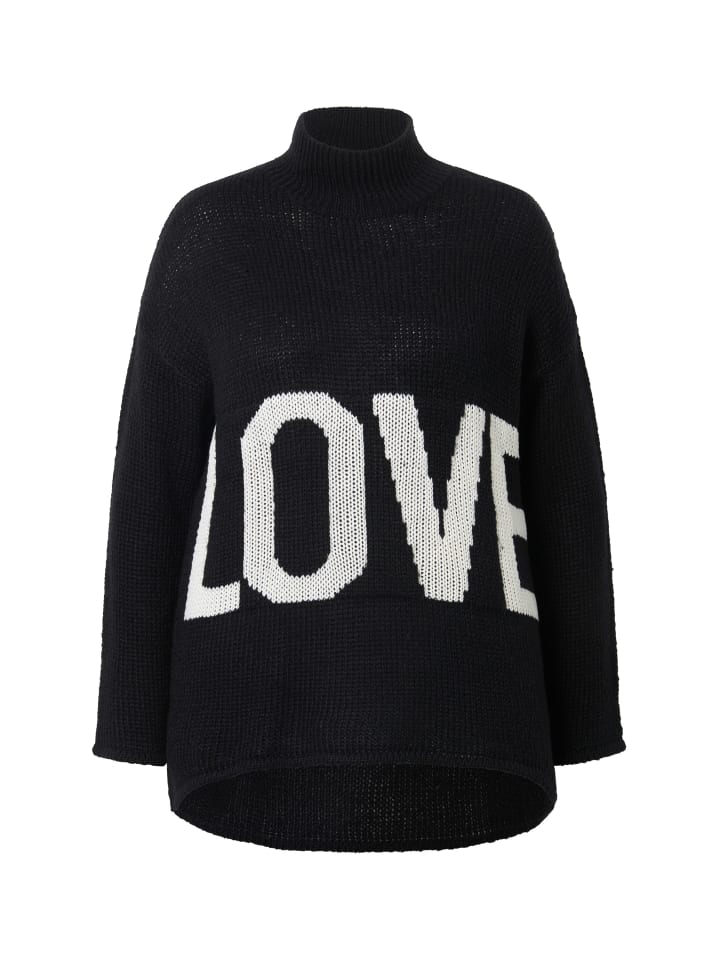 Свитер А-силуэта из очень мягкой тонкой пряжи с крупным логотипом LOVE. Воротник-стойка, спущенная линия плеча, длинные рукава. Гладкий нижний край.