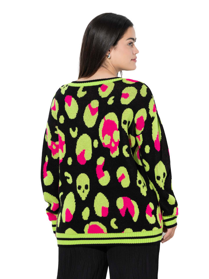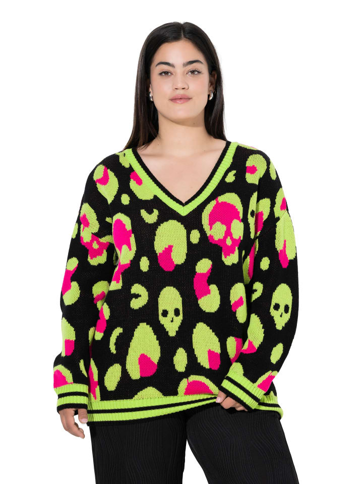 Свитер свободного кроя из мягкой тонкой пряжи с рисунком черепа. V-образный вырез, спущенная линия плеча, длинные рукава. Манжеты на резинке.