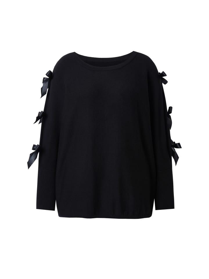 Свитер удобной посадки из мягкой тонкой пряжи. Особенности: длинные рукава с бантами и широкими манжетами в рубчик. Вырез горловины «лодочка».