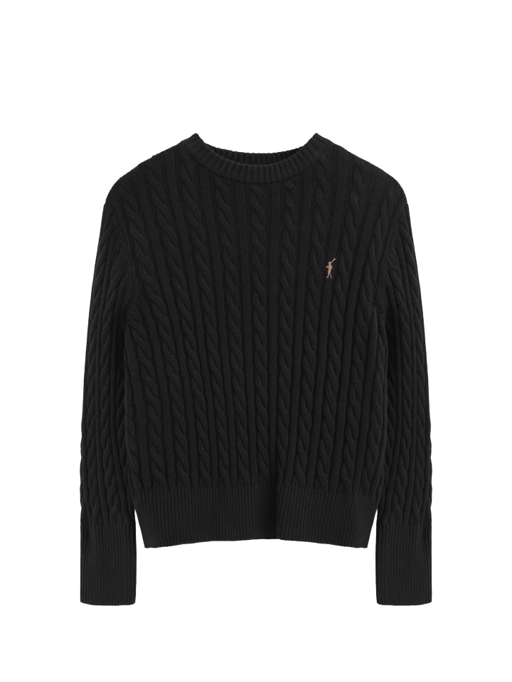 Женский свитер прямого кроя с длинными рукавами, круглым вырезом. Изготовлен из смеси шерсти и хлопка, с узором «косички». Удобный и неподвластный времени предмет одежды.