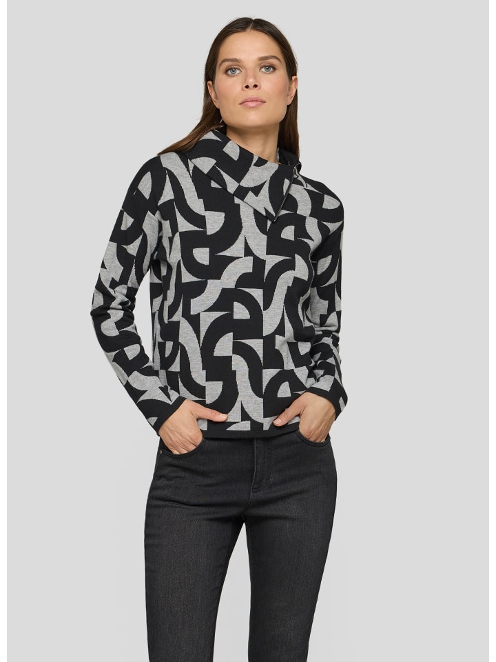 Этот модный свитер привлекает внимание контрастным рисунком по всей поверхности. Мягкая текстурированная ткань с высоким содержанием вискозы обеспечивает комфорт и сохраняет форму. Свободный крой дополняется высоким воротником со шнурком, что добавляет спортивного штриха. Сдержанные цвета делают этот свитер достаточно универсальным для сочетания с другими вещами. Воротник со шнурком. Графический мотив по всей поверхности. Свободный крой с длинными рукавами.