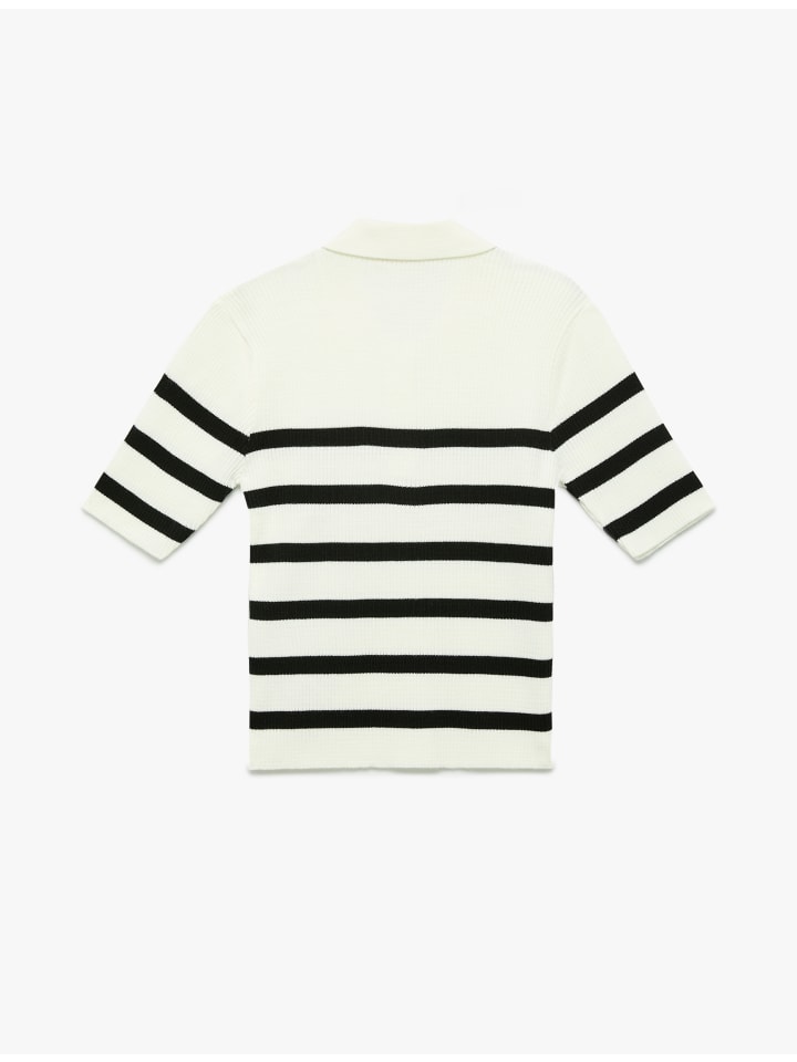 Этот полосатый свитер-поло сочетает в себе элегантность с современным дизайном. Воротник и пуговицы придают ему классический вид, а короткие рукава идеально подходят для теплых дней. Тонкая вязка обеспечивает комфортное ощущение. Идеально сочетается с брюками или юбками, создавая стильный образ, подходящий как для повседневной носки, так и для офиса.