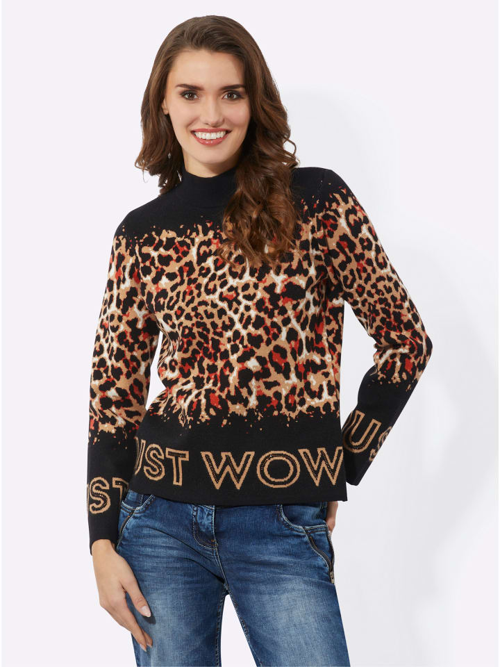 ПРОСТО ВАУ! Надпись на подоле и манжетах длинных рукавов - настоящая изюминка этого свитера! Еще одна модная деталь - сочетание яркого жаккардового рисунка с анималистичным принтом и однотонных участков на манжетах. Теплый воротник-стойка. Изготовлен из мягкой, хорошо сохраняющей форму ткани.