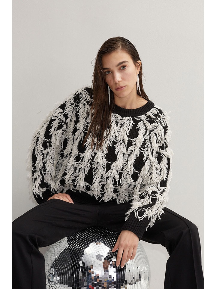 - Ребристая вязка: Вырез горловины, манжеты, подол