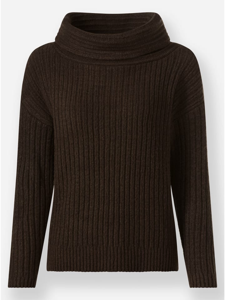 Свитер модного ребристого кроя с модной водолазкой свободного кроя. Имеет непринужденно спущенное плечо и длинные рукава.