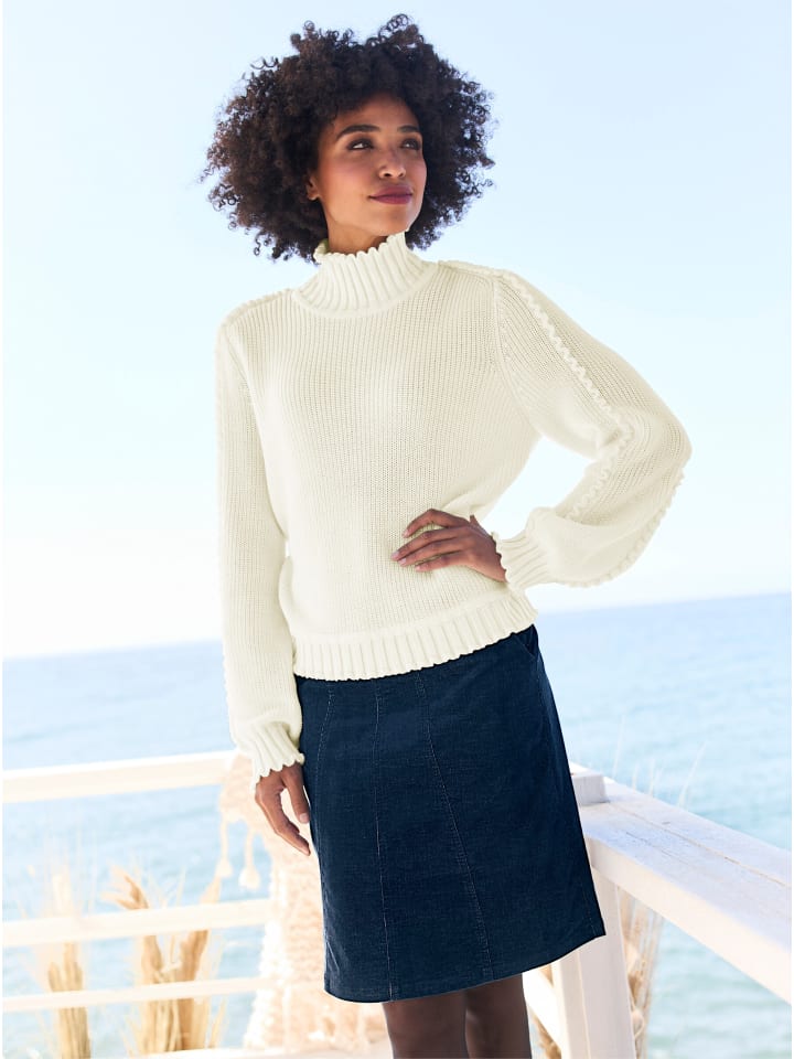 Мягкий свитер крупной вязки с игривыми оборками. Отличается воротником-стойкой, плечевым швом спереди и длинными рукавами-фонариками. Ребристые манжеты. В поддержку инициативы «Хлопок, сделанный в Африке».