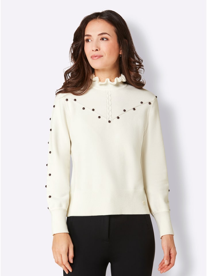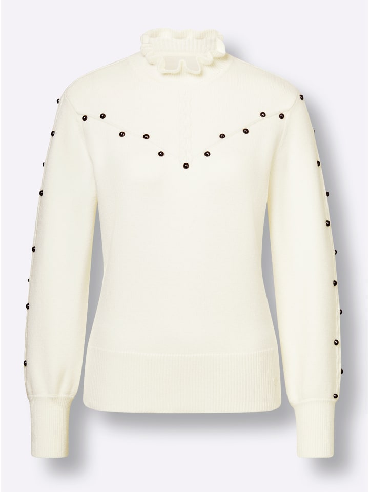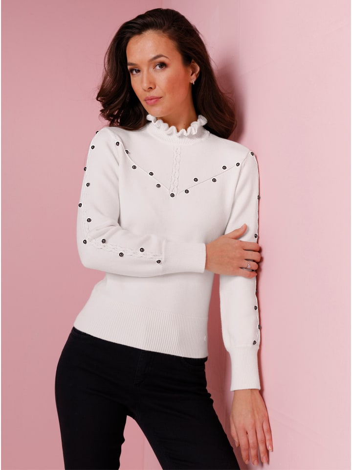 Свитер из модала и полиамида, актуальный узор вязки украшен мелкими мерцающими декоративными бусинами. Воротник-стойка с оборкой. Тщательно провязанный, идеально сидит по фигуре, манжеты с высокой резинкой на концах. Логотип с перламутровым эффектом.