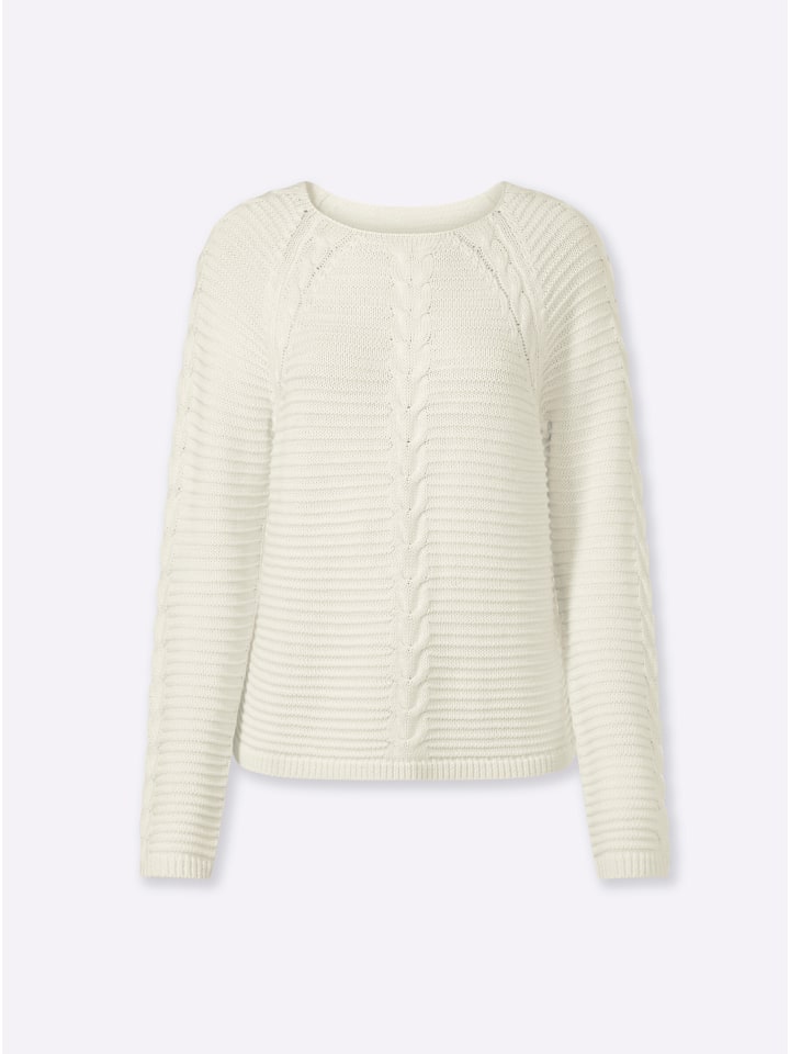 Свитер из воздушной ленточной пряжи с эффектной текстурированной вязкой и косами. Круглый вырез горловины, длинные рукава реглан и ребристые манжеты. Поддерживает инициативу «Хлопок, сделанный в Африке».
