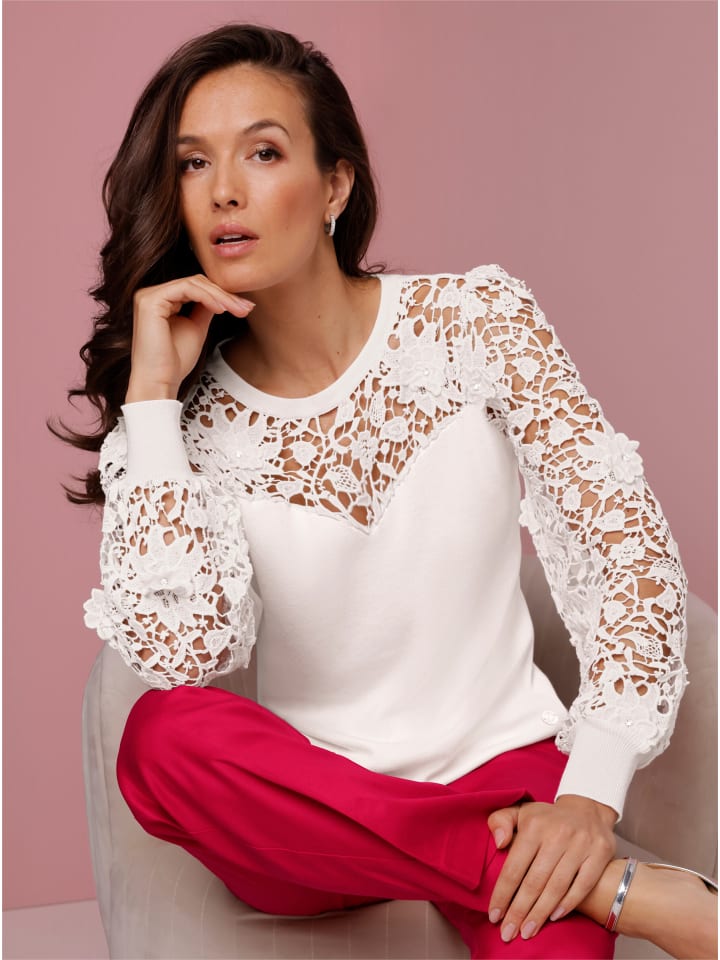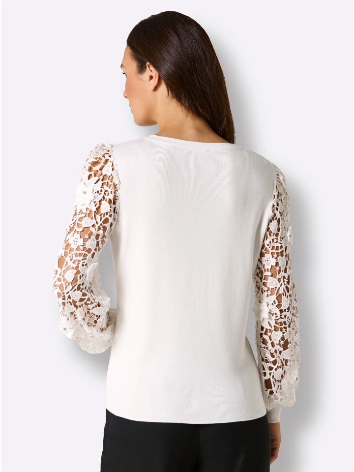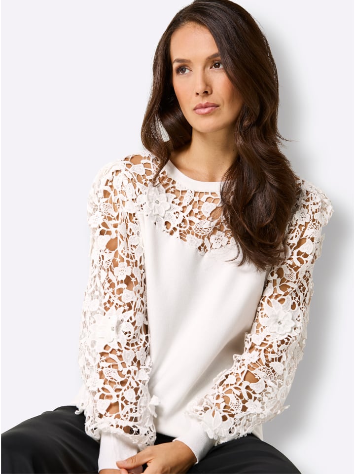 Пуловер из лиоцелла и вискозы. Цветочное кружево на вырезе в форме сердечка и на рукавах превращает эту модель в настоящую летнюю мечту. Украшен сверкающими стразами. Длинные кружевные рукава слегка расклешенной формы со складками на плечах и высокими ребристыми манжетами. Перламутровый логотип-подвеска. Удивительно мягкий состав.