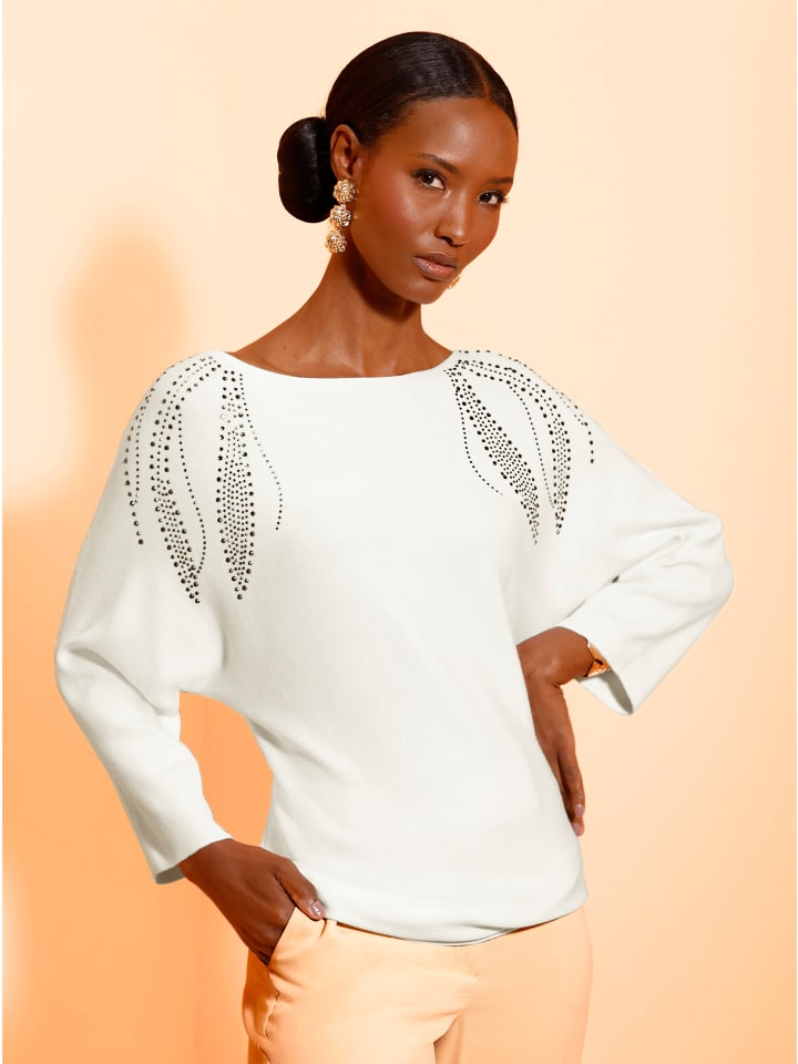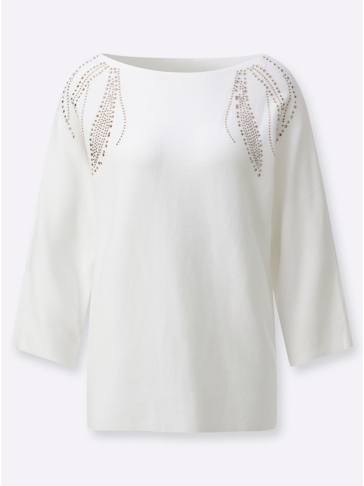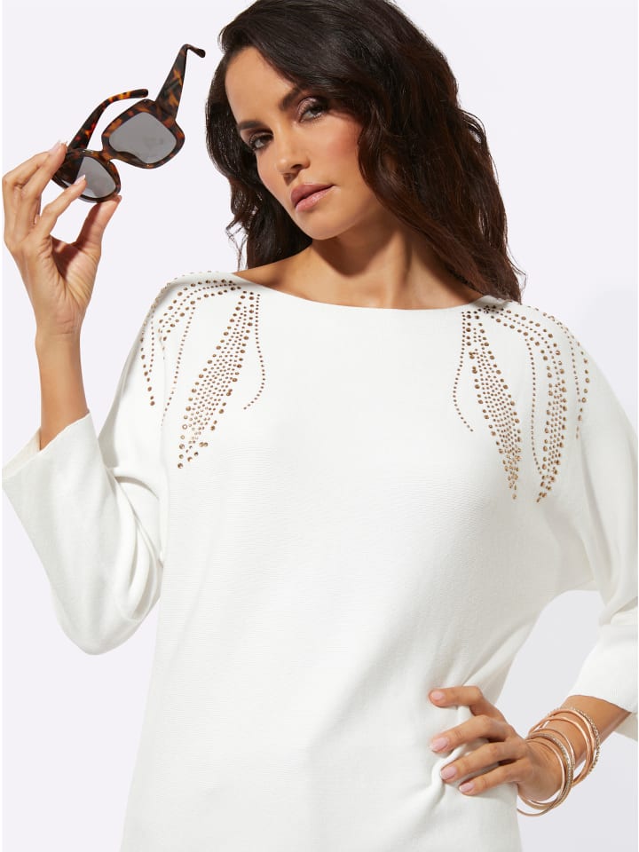 Этот модный свитер из лиоцелла и вискозы поперечной вязки отличается роскошной тонкой вязкой, вырезом-лодочкой и рукавами «летучая мышь» длиной три четверти. Золотистые блестящие камни добавляют сверкающие акценты. Изготовлен из вискозы Lenzing ECOVERO.