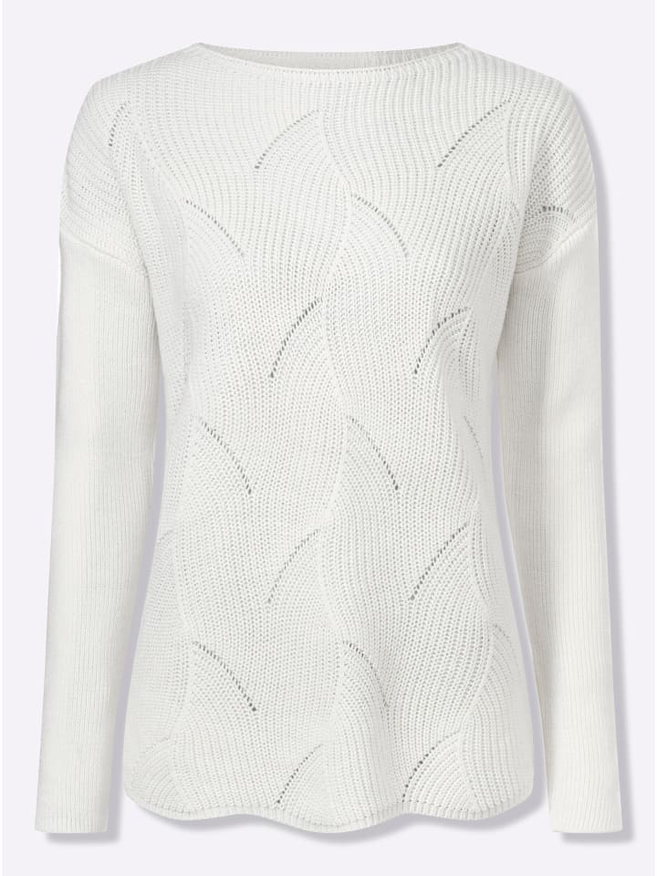 Свитер с вырезом лодочкой, современным узором вязки и длинными рукавами, связанными резинкой. Низ ребристый и волнистый.