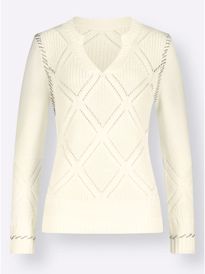 Ажурная ромбовидная вязка по всему изделию придает свитеру спортивный характер. Ребристая отделка на комбинированном круглом/V-образном вырезе, длинных рукавах и подоле. Контрастные декоративные швы на притачных рукавах и манжетах добавляют акценты.