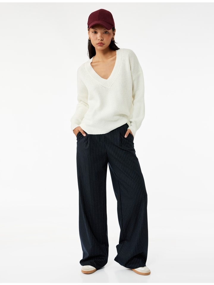 Этот свитер с V-образным вырезом сочетает в себе элегантный и современный дизайн. Длинные рукава идеально подходят для прохладных дней. Мягкая и удобная трикотажная ткань обеспечивает комфорт в течение всего дня. Благодаря свободному крою свитер подчеркивает любую фигуру и добавляет стильный штрих к вашему образу. Он идеально сочетается с джинсами или юбкой для создания современного образа.