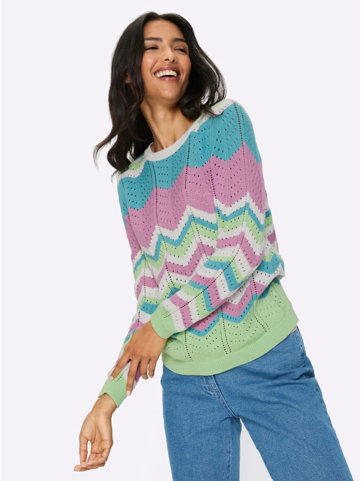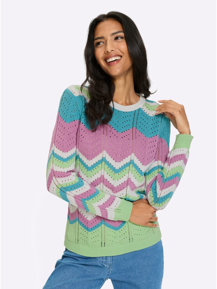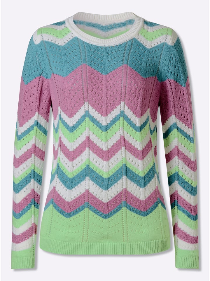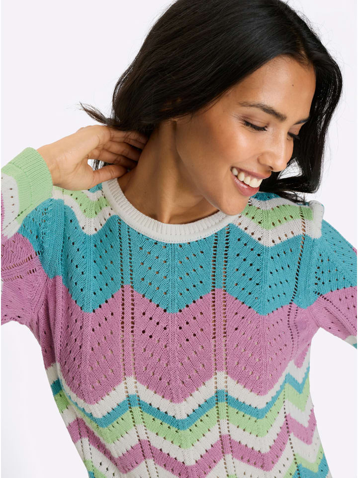 Вам понравится этот ажурный свитер с фантастическим полосатым рисунком! Ребристые манжеты на длинных рукавах и подоле. Тщательно связан по фигуре.
