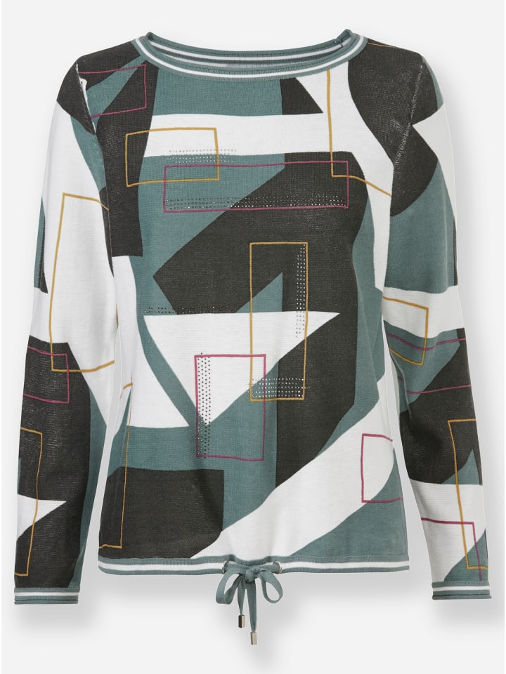Графический принт этого свитера великолепно смотрится на фоне мягкой, эластичной вязки. Передняя часть украшена стразами. Тщательно продуманная конструкция обеспечивает идеальную посадку: вырез лодочкой и длинные рукава с подвернутым краем. Подол регулируется люверсами и шнурком. Изделие соответствует инициативе «Сделано в Африке» (Cat Made in Africa).