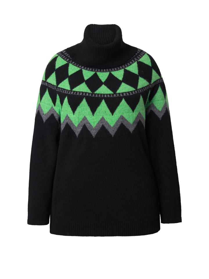 Водолазка, классического кроя, из мягкой пряжи с цветным узором «фэр-айл». Мягкая воланажная горловина, длинные рукава реглан.