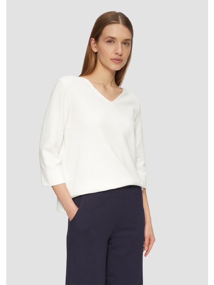 Эта структурированная трикотажная толстовка с V-образным вырезом впечатляет своей мягкостью и комфортом, а также спортивно-элегантными полосками. Рукава 3/4 и боковые разрезы по низу делают ее идеальным дополнением к непринужденным повседневным образам.