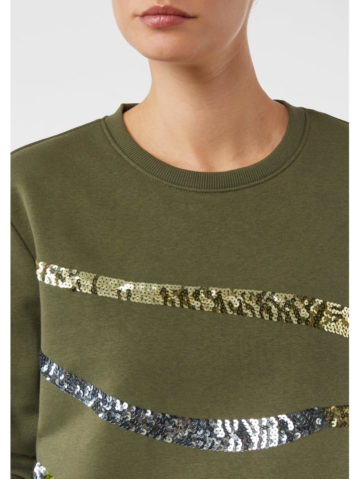 Эта толстовка средней длины свободного кроя сочетает в себе повседневный комфорт и гламурный вид. Мягкая ткань толстовки приятно приятна к телу, а сверкающий рисунок пайетками с блестящим принтом привлекает внимание. Классический круглый вырез горловины, длинные рукава и спортивные ребристые манжеты по подолу и рукавам идеально дополняют дизайн. Вы можете легко сочетать эту универсальную вещь с джинсами для создания непринужденного повседневного образа или надеть с элегантными брюками для вечернего выхода. Незаменимая вещь для стильных женщин!