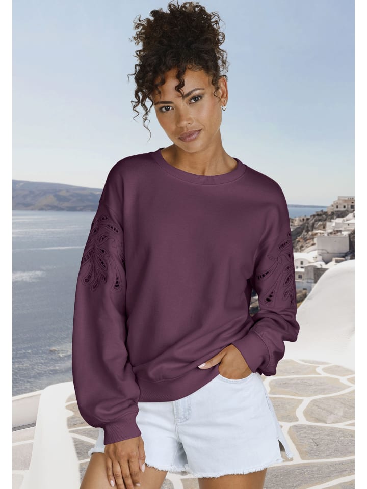 Удобная толстовка от Vivance с красивой кружевной вышивкой на плечах. Круглый вырез горловины и ребристые манжеты. Спущенное плечо для свободной посадки. Легко стилизовать. Мягкая хлопковая ткань толстовки.