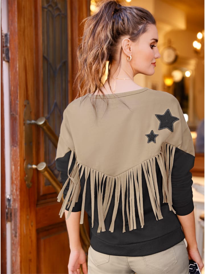 Эта толстовка производит ошеломляющее впечатление благодаря модному сочетанию аппликаций со звездами спереди и сзади, а также игривой бахромы вдоль V-образного шва сзади. Свободный крой, спущенные плечи, круглый вырез горловины и ребристые манжеты. Внутренняя часть мягкая и теплая благодаря подкладке из флиса с начесом. Поддерживает инициативу «Сделано в Африке» (Cat Made in Africa).