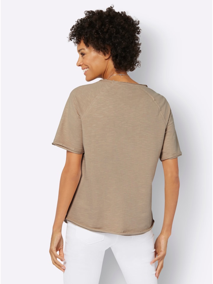 Толстовка с подвернутыми манжетами и декоративной строчкой на круглом вырезе горловины, а также короткими рукавами реглан. Слегка закругленный подол. Модные необработанные края. Поддерживает инициативу «Хлопок, сделанный в Африке».